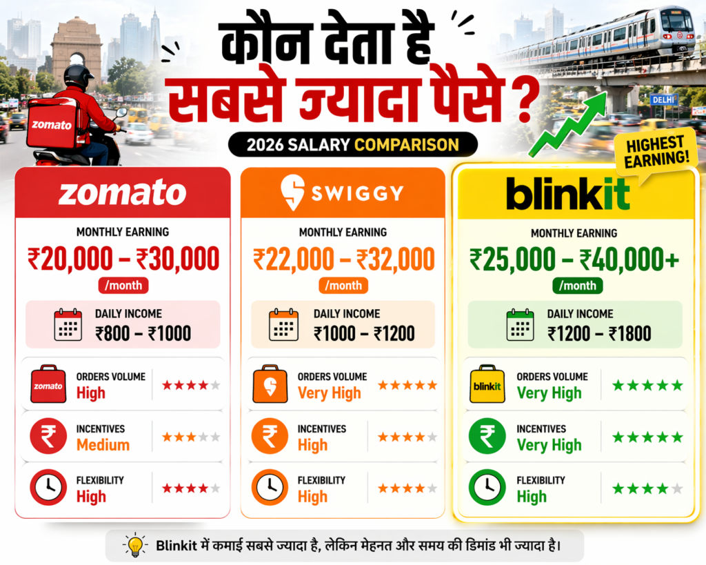 अगर आप delivery job शुरू करना चाहते हैं, तो सबसे बड़ा सवाल यही होता है: Zomato, Swiggy या Blinkit — कौन ज़्यादा पैसे देता है?